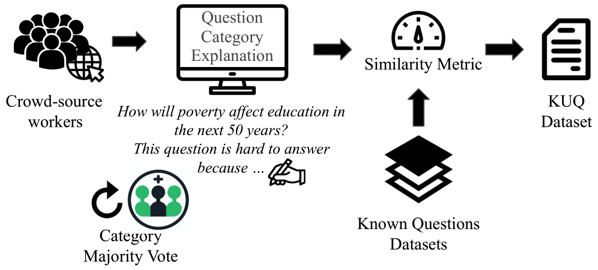 We have collected unknown questions from crowd-source workers and generated a new dataset: Known- Unknown Questions, KUQ. This is questions which do not have an answer. And these questions are paired with known questions from datasets like SQuAD, TriviaQA, HotPotQA. In total, it contains 6884 questions.